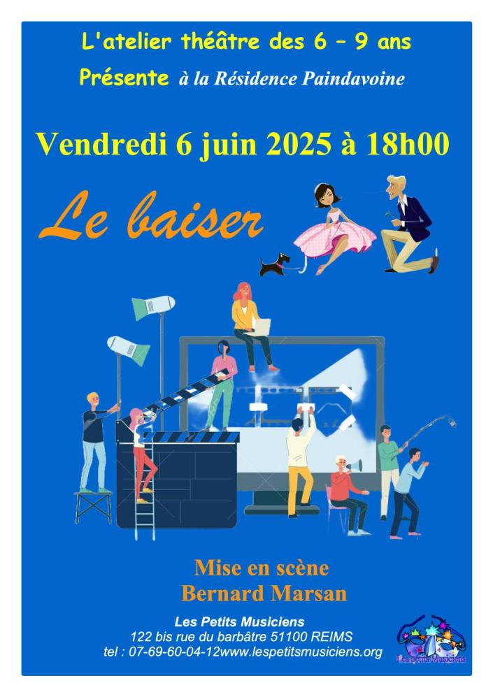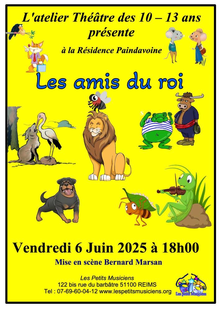 Atelier des 6 – 9 ans /10 – 13 ans : Vendredi 6 juin 2025 . Les représentations théâtrales des 6 – 9 ans et des 10 – 13 ans auront lieu à la résidence Paindavoine située au 1 rue du lieutenant Herduin 51100 REIMS. Le programme sera consultable à partir du mois d’avril dans l’onglet Spectacles
