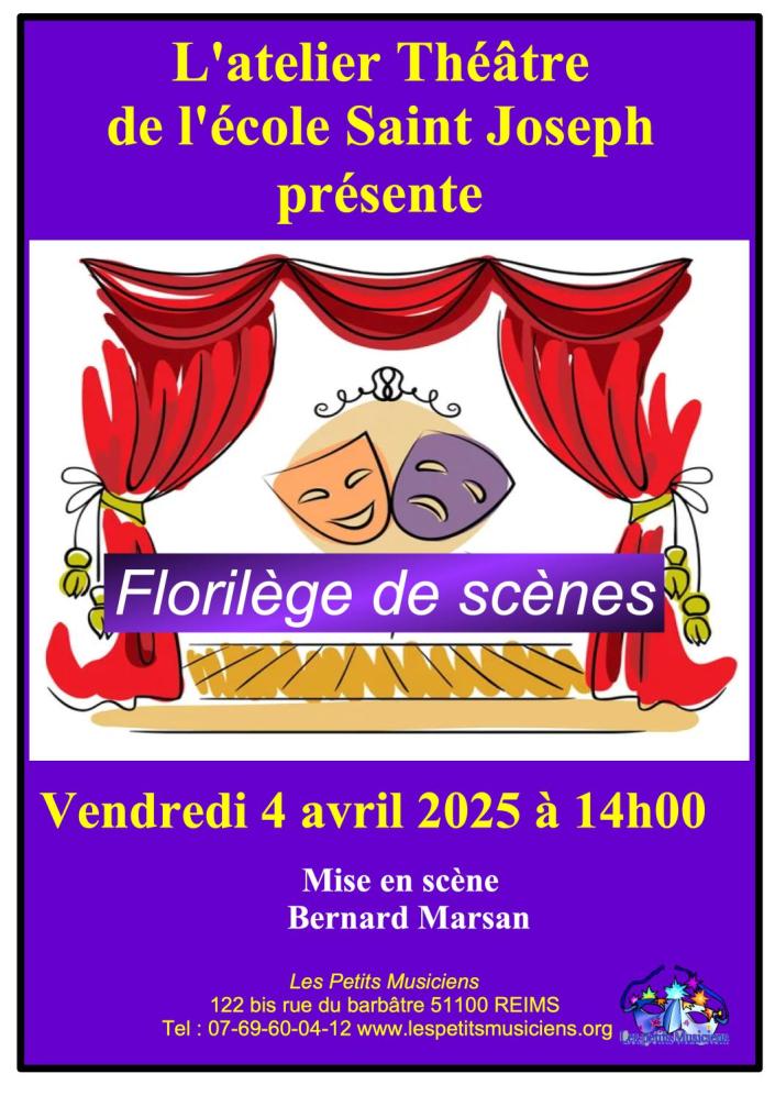 Ecole Saint Joseph : représentation de l’atelier théâtre des 7 – 10 ans le vendredi 4 avril 2025 à 14h. Le programme sera consultable à partir du mois d’avril dans l’onglet Partenaires