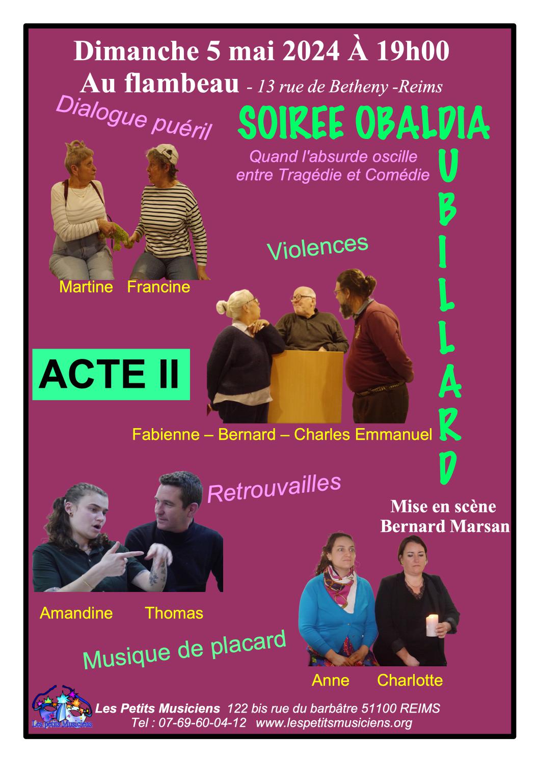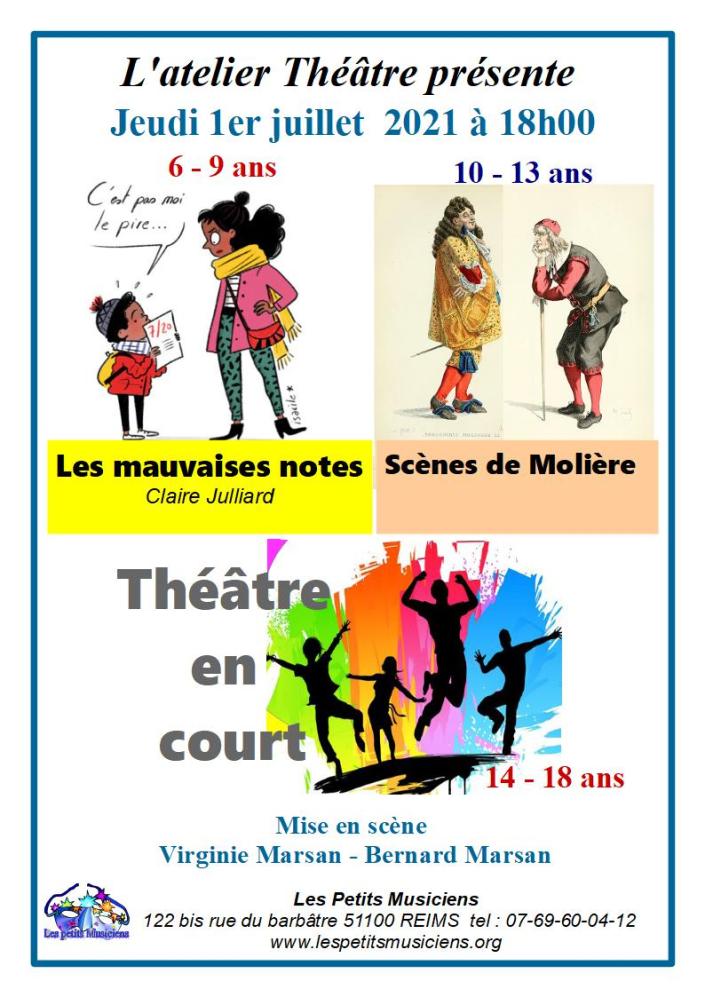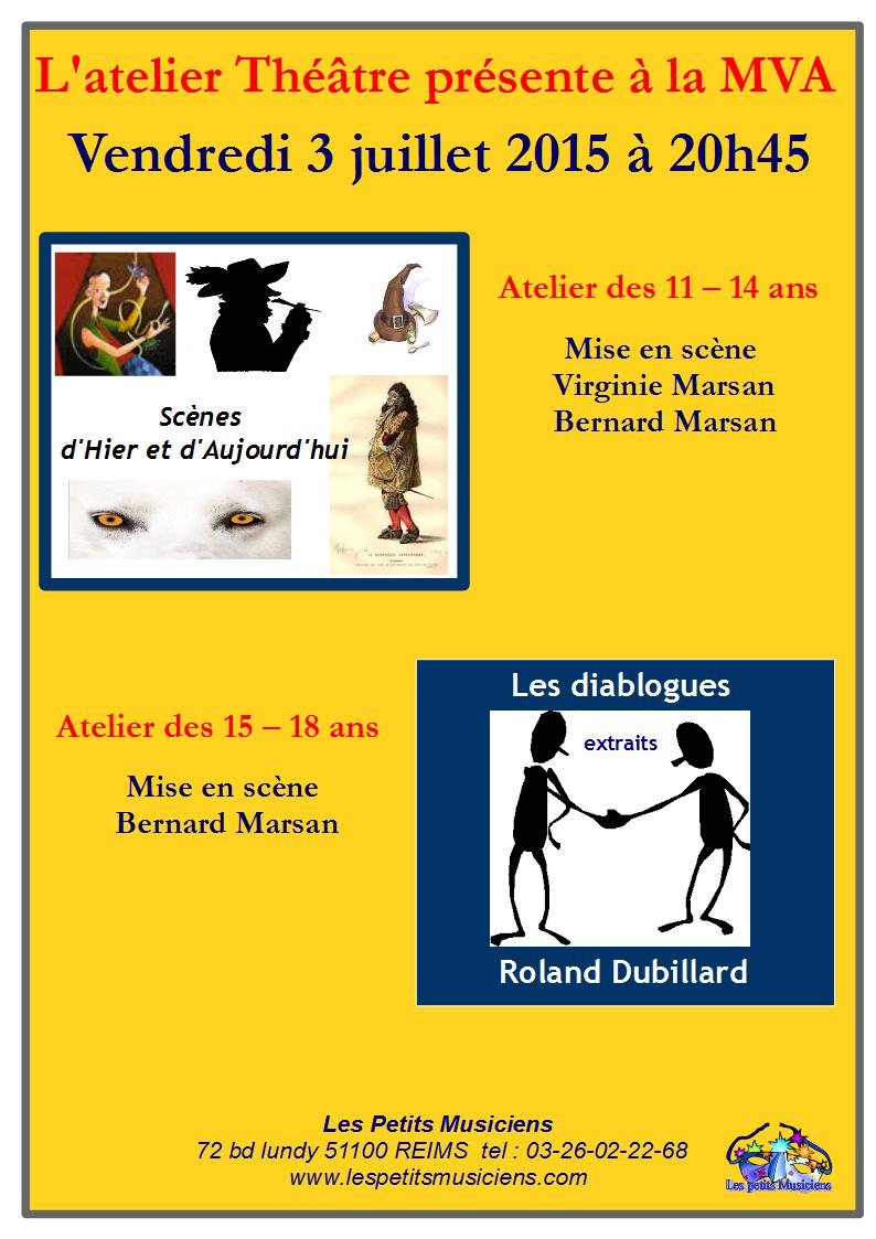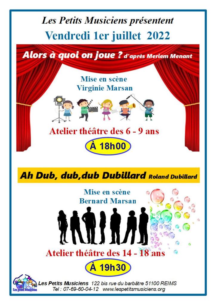 Les 2 représentations ont lieu à L’espace le Flambeau – 13 rue de Betheny à Reims. Tarif par représentation : 8 €. Réservations auprès des Petits Musiciens : 07 69 60 04 12 ou par mail : les-petits-musiciens@orange.fr